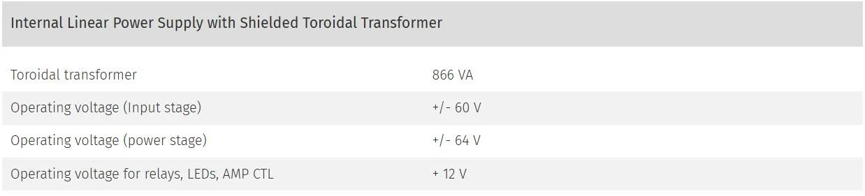 The mains voltage from the mains power socket is transformed to the required secondary voltage in the device’s internal linear power supply with toroidal transformer. Rectifiers convert this AC voltage into DC voltage required in the audio device.