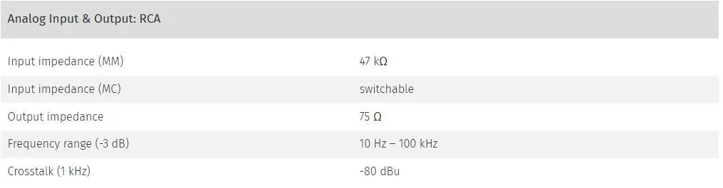 This means that the effects of cable capacitance (from turntable to preamplifier) are negligible. The impedance, however, is relevant and can be set in six positions: 100, 220, 470, 2.2 k, 4.7 k, and 10 kOhm.